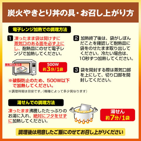 炭火やきとり丼の具は、湯煎やレンジで温めて、ご家庭の出来立てご飯にのせるだけの簡単調理!お好みで、青ねぎや海苔をトッピングとしてのせても美味しくお召し上がりいただけます。