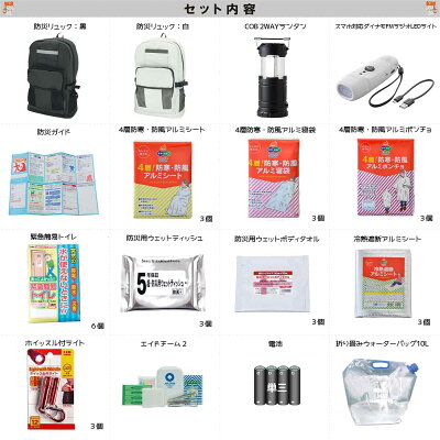 折りたたみウォーターバッグ10L■サイズ:約42×18×37.5cm(使用時) ヘッダー付ポリ袋入りcob 2way ランタン■サイズ:収納時:約8.7×14.3cm 使用時:約8.7×20cm ■材質:PS・スチールスマホ対応タ?イナモFMラシ?オLEDライト■サイズ:約55×145×45mm ■付属品:USB充電接続ケーブル (USB Type-Aオス-MicroUSB Type-Bオス) ■充電目安1分間の回転:ライト点灯時間/約10分間、ラジオ稼働時間/約10分間防災ガイド■本体サイズ:約182×275×0.5mm ■素材:ストーンペーパー緊急簡易トイレ■商品サイズ:トイレ袋/650×550×0.05mm 処理袋/180×450 mm4層防寒・防風アルミシート■サイズ:約2130×1370mm ■材質:アルミ蒸着ポリエチレン4層防寒・防風アルミ寝袋■サイズ:約1000×2000mm ■材質:アルミ蒸着ポリエステル4層防寒・防風アルミホ?ンチョ■サイズ:約1000×1200mm ■材質:アルミ蒸着ポリエステルホイッスル付ライト■サイズ:約・ライト:直径13×全長56mm ホイッスル:直径8×全長47mm ■材質:アルミニウム スチールエイドチーム2■本体サイズ:約115×76×30 mm ■セット内容:ハサミ、つめきり、ピンセット、ワンタッチ包帯、 綿棒×10本、コットン×3枚、絆創膏×5枚冷熱遮断アルミシート■サイズ:約900×1500×2mm ■材質:発砲ポリエチレン、アルミ蒸着シート防災用ウェットボディタオル■本体サイズ:約90×30cm ■素材:レーヨン・ポリエステル防災用ウエットティッシュ■内容:150×200mm×20枚電池アルカリ乾電池 単3商品について緊急災害時や注文殺到時パッケージの違う商品になる場合がございます。
