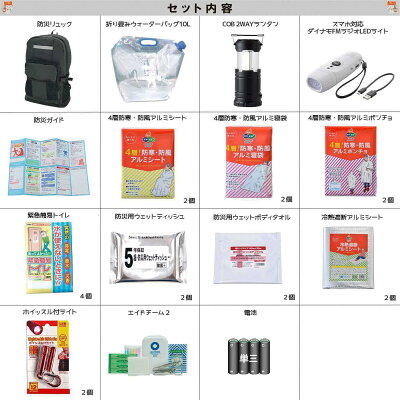 あんしん保存水■内容量:500mL折り畳み 給水タンク 10L■サイズ:約42×18×37.5cm(使用時) ヘッダー付ポリ袋入りcob 2way ランタン■サイズ:収納時:約8.7×14.3cm 使用時:約8.7×20cm ■材質:PS・スチール防災ガイド■本体サイズ: 約182×275×0.5mm ■素材: ストーンペーパースマホ対応タ?イナモFMラシ?オLEDライト■サイズ: 約55×145×45mm ■付属品: USB充電接続ケーブル (USB Type-Aオス-MicroUSB Type-Bオス) ■充電目安1分間の回転:ライト点灯時間/約10分間、ラジオ稼働時間/約10分間緊急簡易トイレ■商品サイズ: トイレ袋/650×550×0.05mm 処理袋/180×450 mm4層防寒・防風アルミシート■サイズ: 約2130×1370mm ■材質: アルミ蒸着ポリエチレン4層防寒・防風アルミ寝袋■サイズ: 約1000×2000mm ■材質: アルミ蒸着ポリエステル4層防寒・防風アルミホ?ンチョ■サイズ: 約1000×1200mm ■材質: アルミ蒸着ポリエステルホイッスル付ライト■サイズ: 約・ライト:直径13×全長56mm ホイッスル:直径8×全長47mm ■材質: アルミニウム スチールエイドチーム2■本体サイズ: 約115×76×30 mm ■セット内容: ハサミ、つめきり、ピンセット、ワンタッチ包帯、 綿棒×10本、コットン×3枚、絆創膏×5枚冷熱遮断アルミシート■サイズ: 約900×1500×2mm ■材質: 発砲ポリエチレン、アルミ蒸着シート防災用ウェットボディタオル■本体サイズ: 約90×30cm ■素材: レーヨン・ポリエステル防災用ウエットティッシュ■内容: 150×200mm×20枚カゴメ 野菜1日これ一本 長期保存用■商品サイズ:110mmx325mmx268mm ■内容量:190g ■カロリー:(1本/190g当たり) 77kcal ■賞味期間:製造時から5.5年清潔スリッパ■サイズ:275×100×65mm ■重量:54g ■材質:ポリエステルニット、EVA軍手滑り止め付き電池アルカリ乾電池 単3商品について緊急災害時や注文殺到時パッケージの違う同等商品になる可能性がございます。